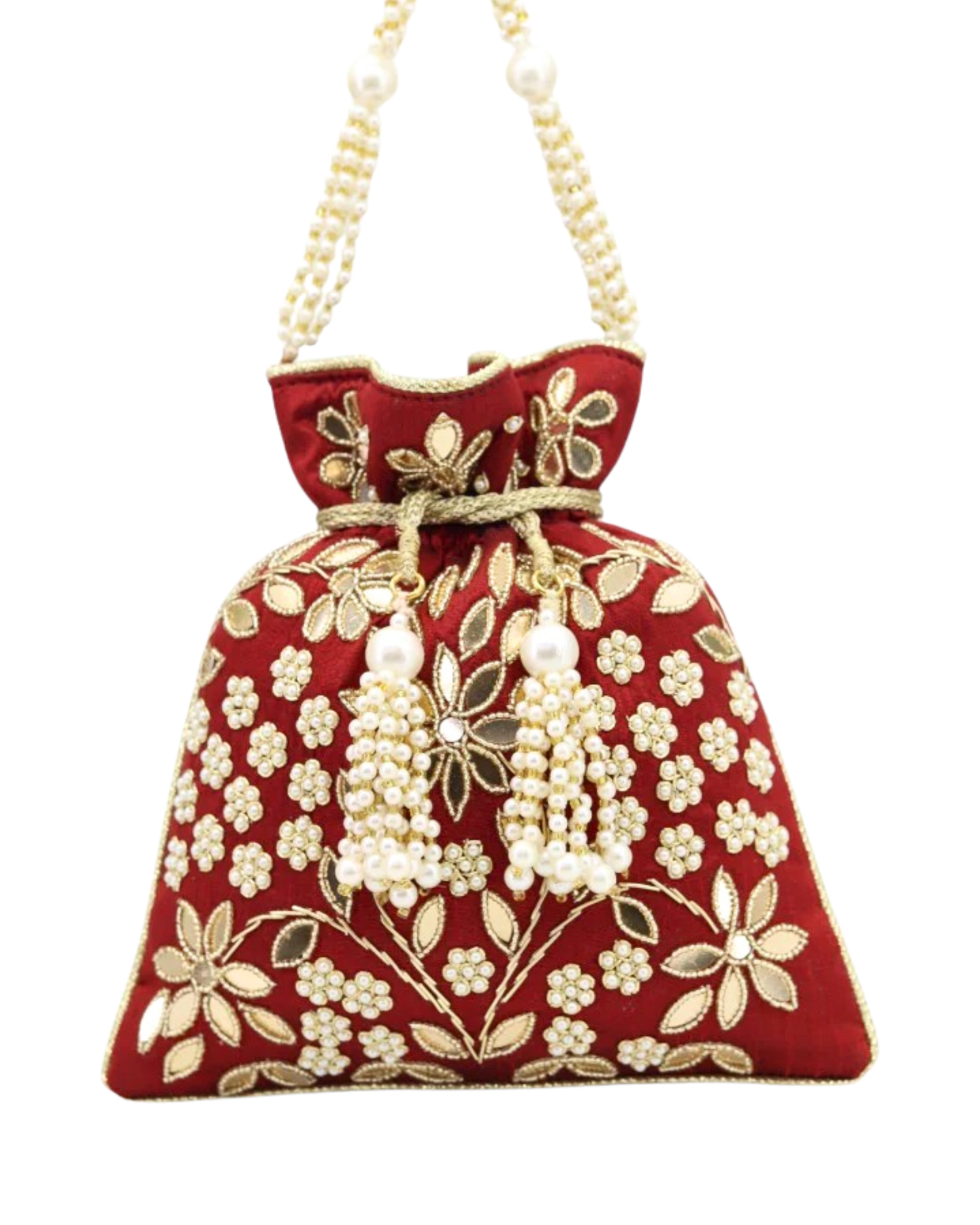 The Mysha Potli features delicate hand-embroidered motifs and a soft festive look, perfect for mehendi, weddings, sangeet nights, and thoughtful gifting.