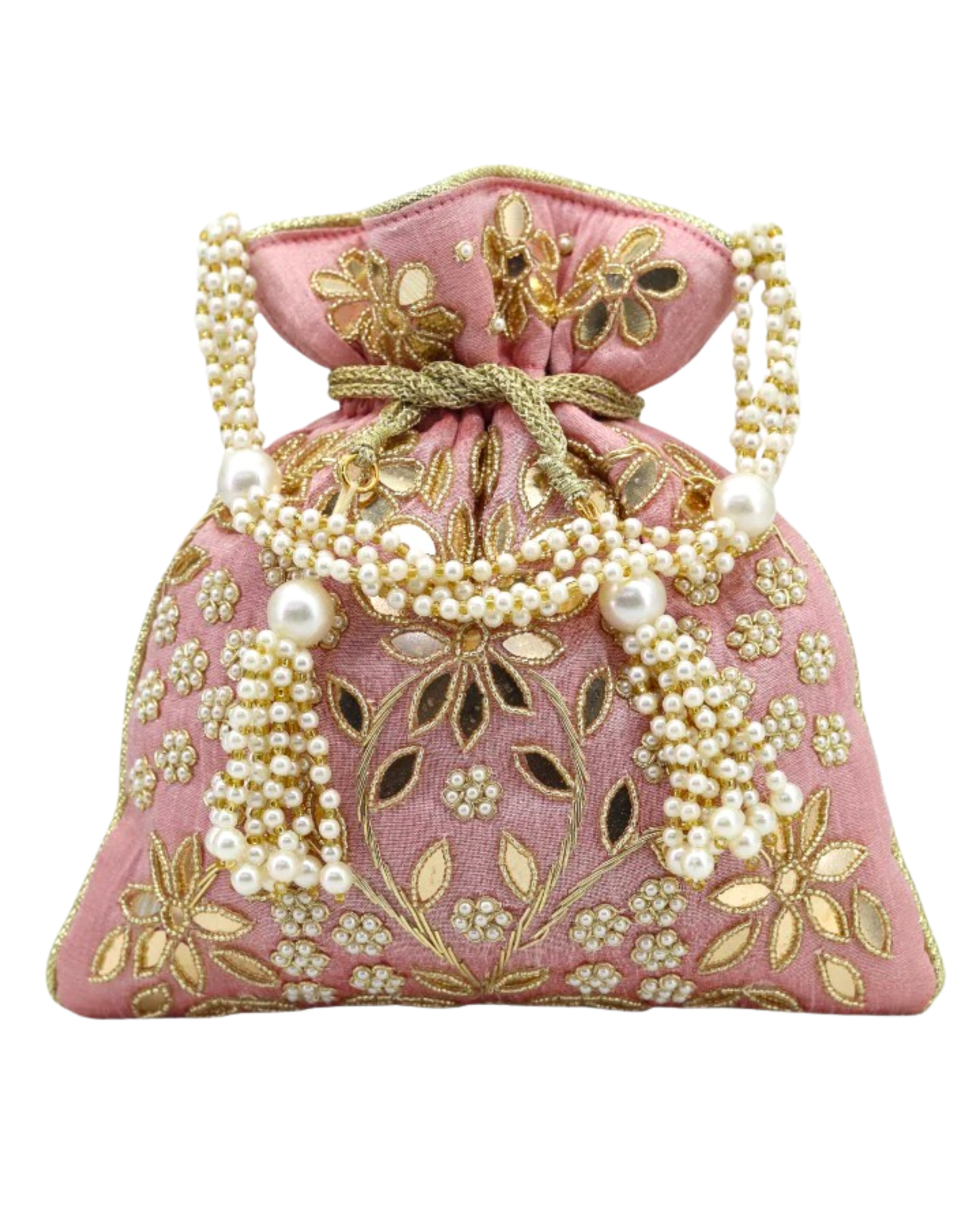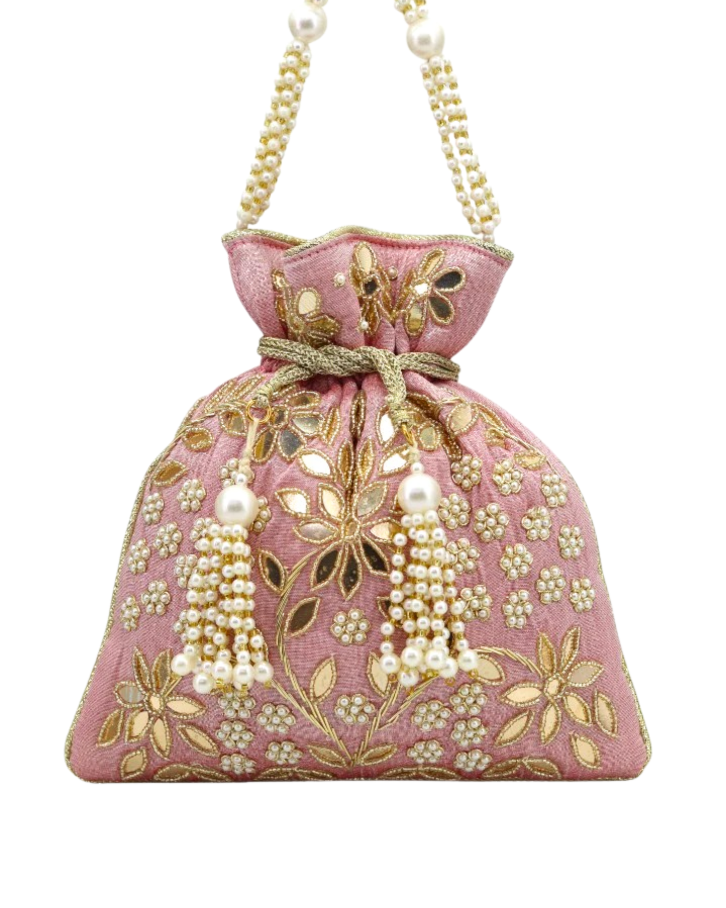 The Mysha Potli features delicate hand-embroidered motifs and a soft festive look, perfect for mehendi, weddings, sangeet nights, and thoughtful gifting.