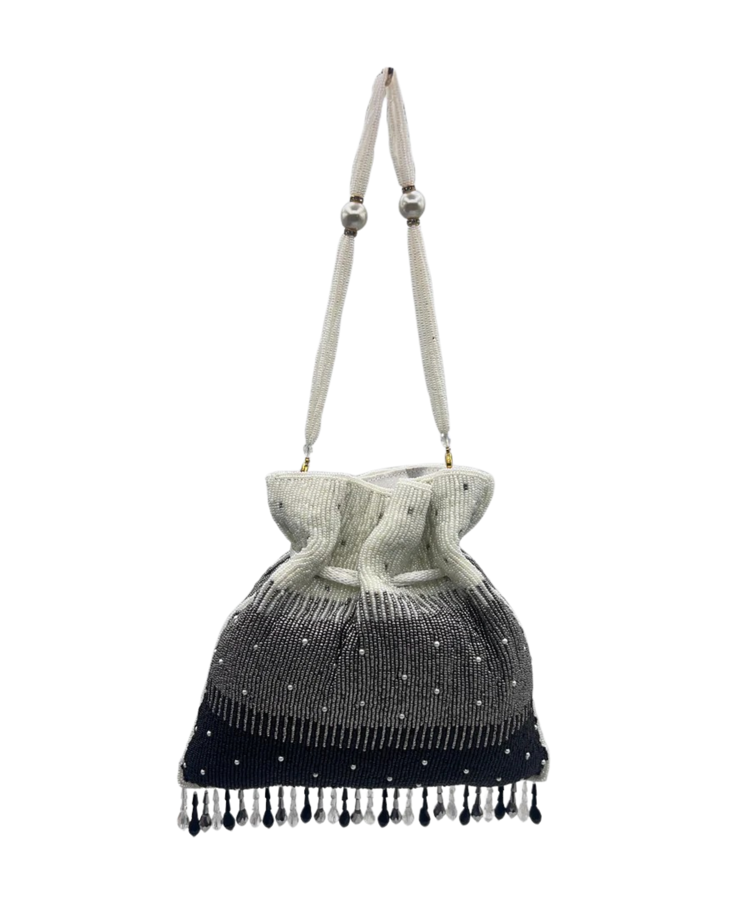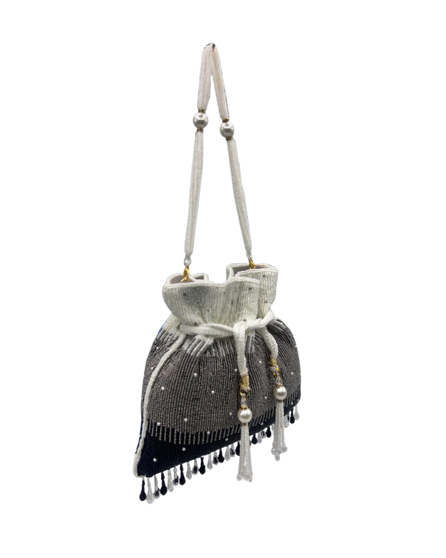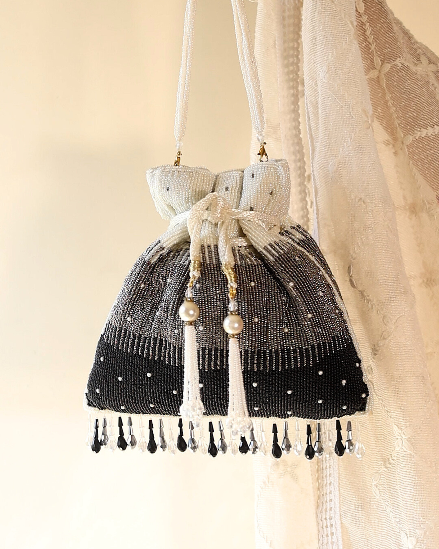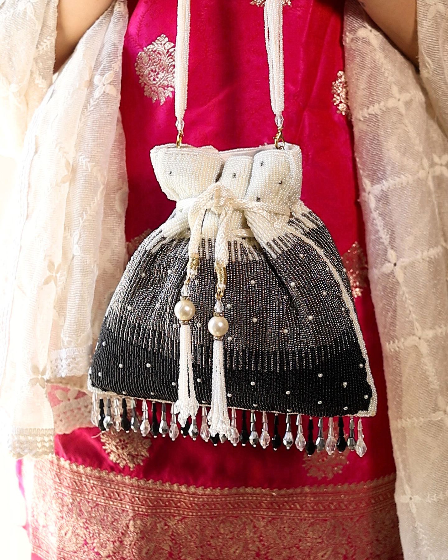 The Prime Black Potli pairs elegant hand embroidery with a soft rose-gold shine, ideal for receptions, festive outfits, weddings, and luxury gifting.
