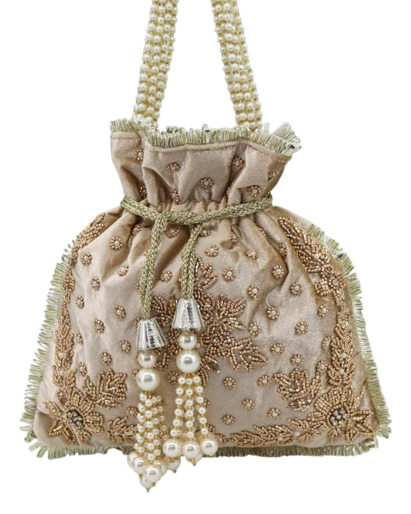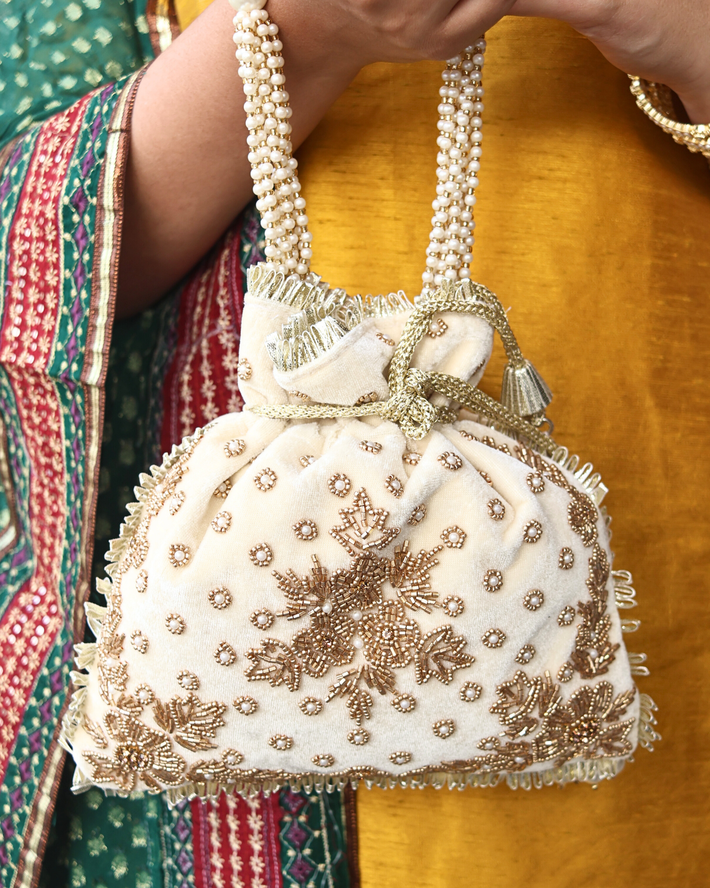 Introducing La Reat's Potli Bag, crafted from premium imported velvet, perfect for adding a touch of sophistication to your festive or special occasion outfits. The luxurious velvet fabric, combined with unique hand-embroidered pearl shapes, creates a captivating and one-of-a-kind design that stands out in any setting. The bag is adorned with delicate pearls and sequins embellishments, adding a touch of sparkle and elegance. Featuring a stunning design and craftsmanship, the Velly Potli Bag is the ideal accessory to elevate your look for weddings, parties, and other formal events.