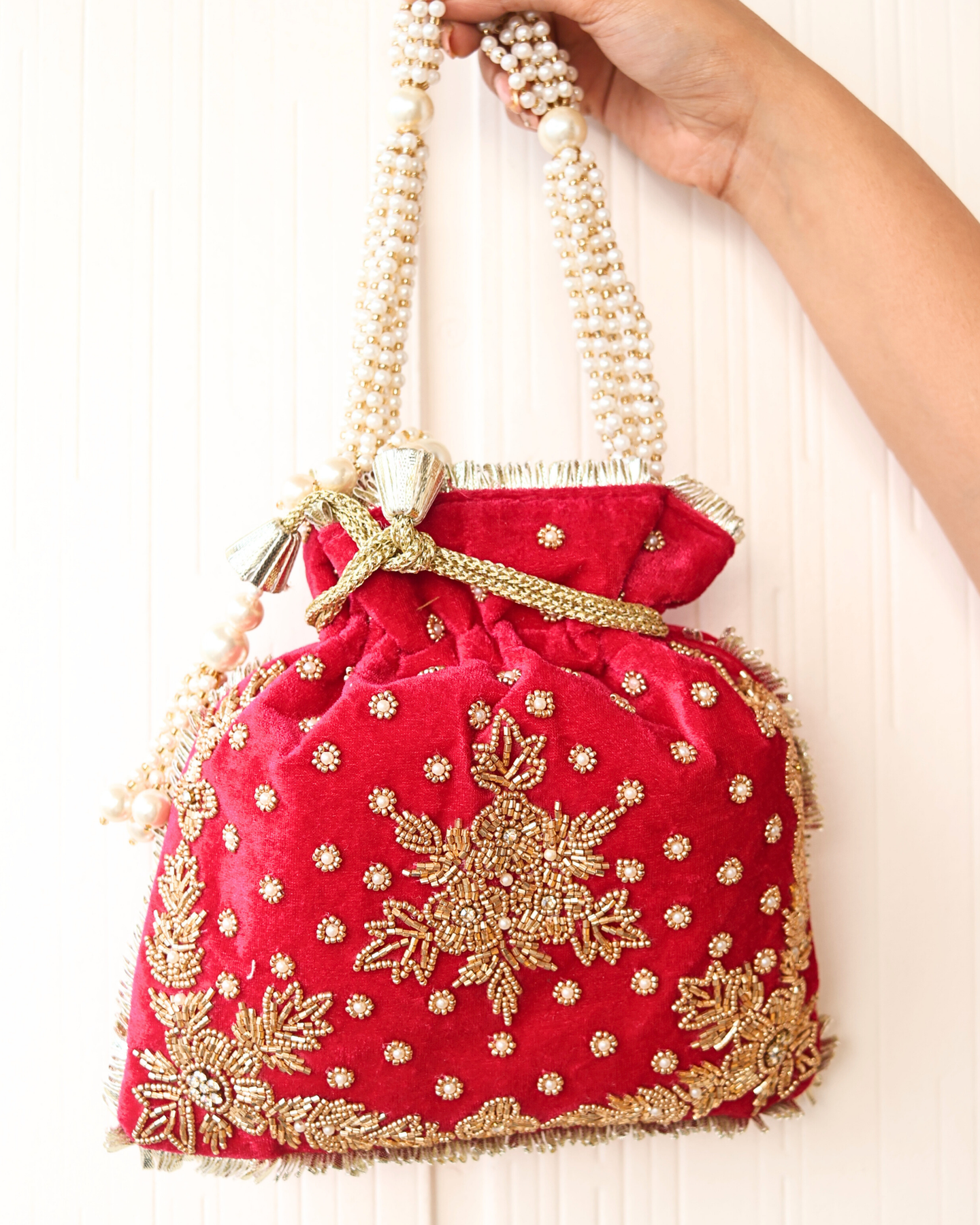 Introducing La Reat's Potli Bag, crafted from premium imported velvet, perfect for adding a touch of sophistication to your festive or special occasion outfits. The luxurious velvet fabric, combined with unique hand-embroidered pearl shapes, creates a captivating and one-of-a-kind design that stands out in any setting. The bag is adorned with delicate pearls and sequins embellishments, adding a touch of sparkle and elegance. Featuring a stunning design and craftsmanship, the Welly Potli Bag is the ideal accessory to elevate your look for weddings, parties, and other formal events.