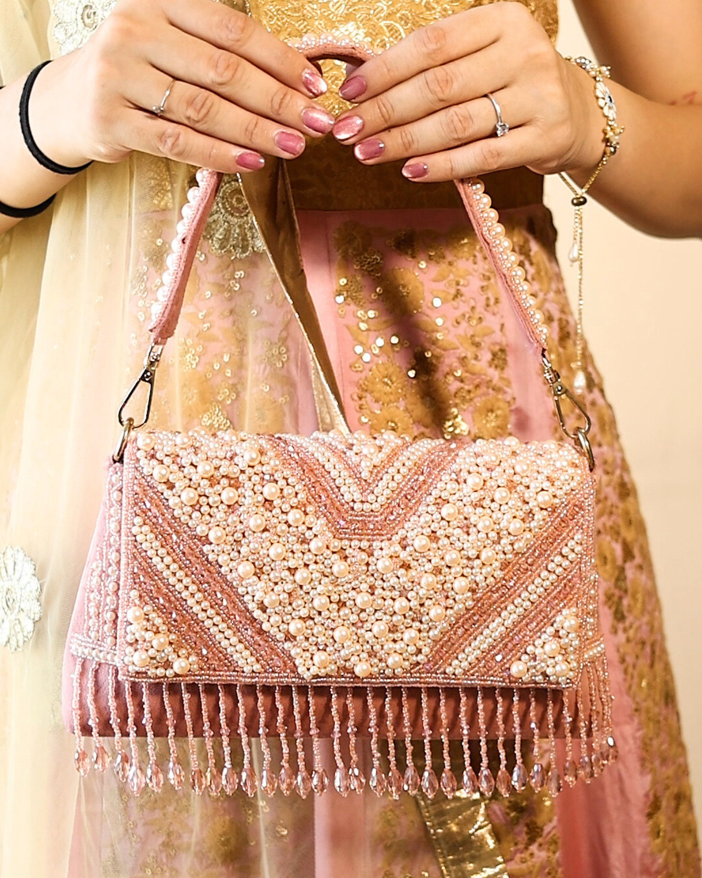 The Divine Hand Clutches features handcrafted pearl embroidery, elegant bead detailing, and a chic embellished handle that adds instant sophistication. Lightweight yet spacious, it’s the perfect accessory for weddings, parties, and festive occasions.