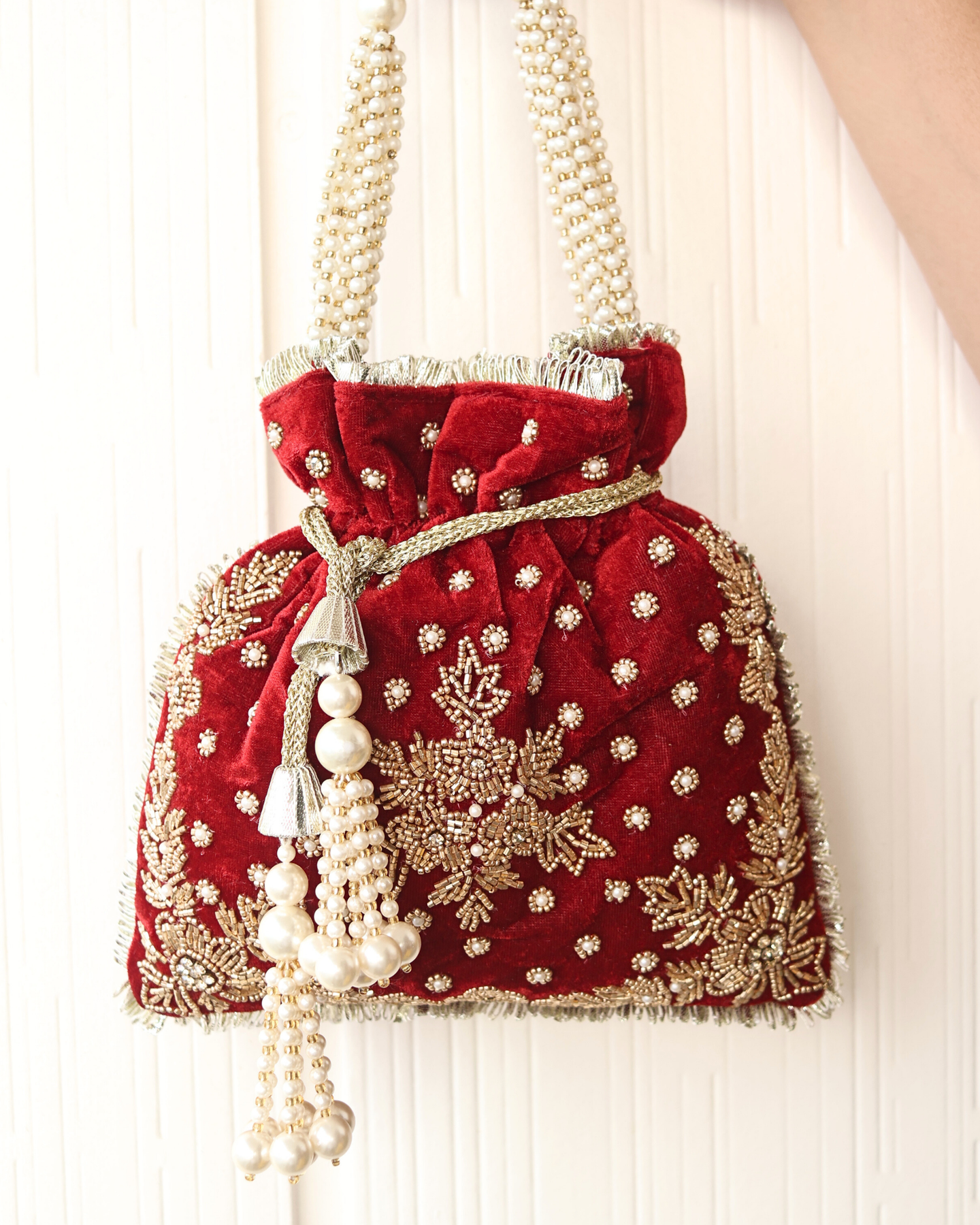 Introducing La Reat's Potli Bag, crafted from premium imported velvet, perfect for adding a touch of sophistication to your festive or special occasion outfits. The luxurious velvet fabric, combined with unique hand-embroidered pearl shapes, creates a captivating and one-of-a-kind design that stands out in any setting. The bag is adorned with delicate pearls and sequins embellishments, adding a touch of sparkle and elegance. Featuring a stunning design and craftsmanship, the Welly Potli Bag is the ideal accessory to elevate your look for weddings, parties, and other formal events.