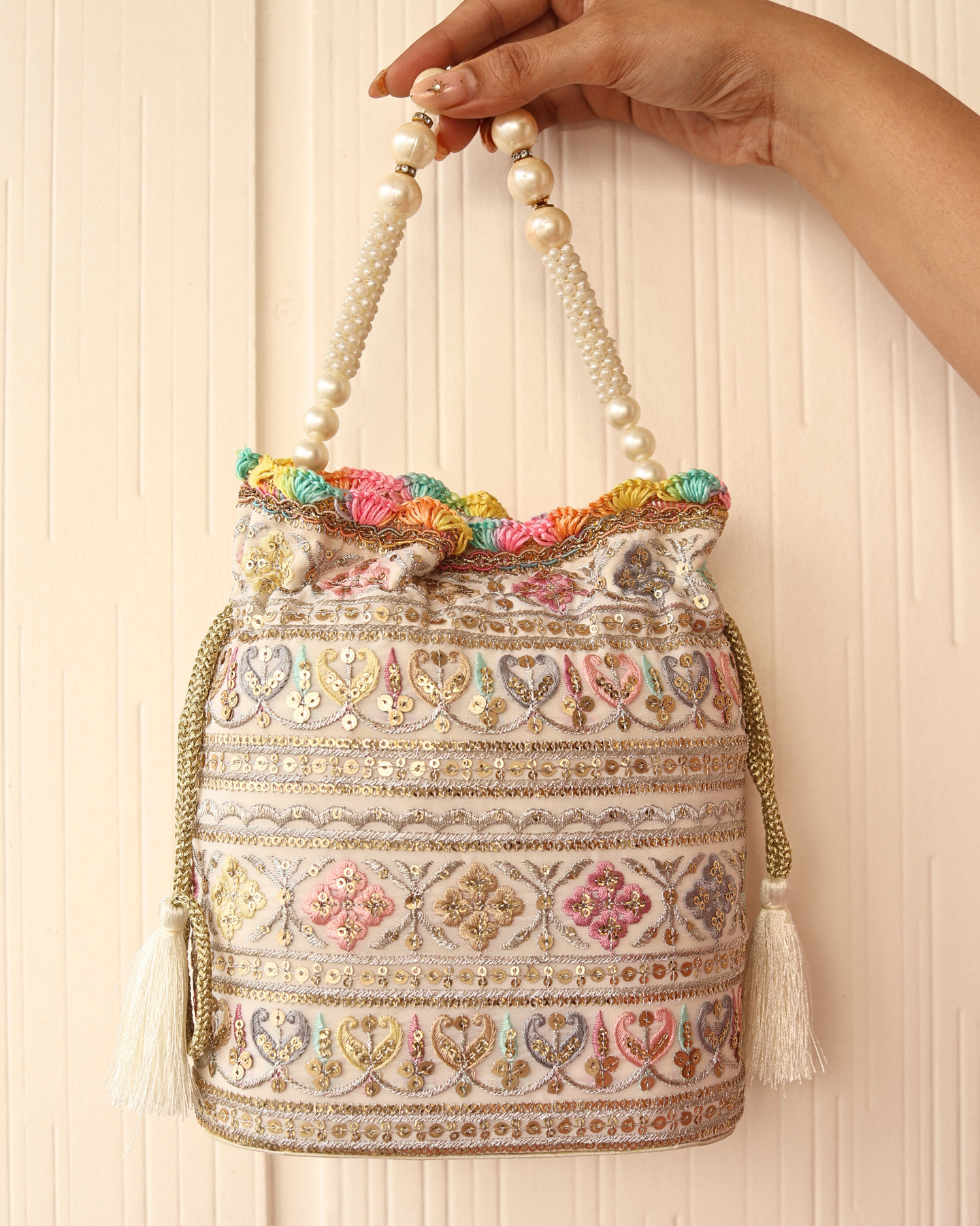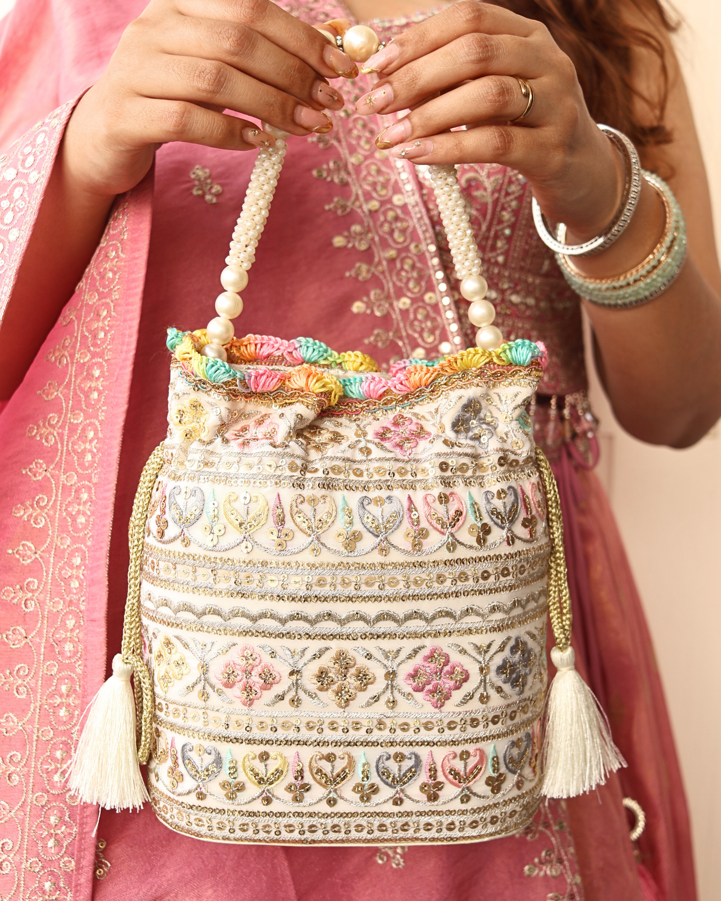 The Rimsy Potli comes with vibrant multi-colour embroidery, shimmering sequins, and a premium pearl handle that adds a festive, stylish touch to any outfit. Lightweight and spacious, it’s perfect for weddings, haldi–mehendi events, and colourful celebrations.