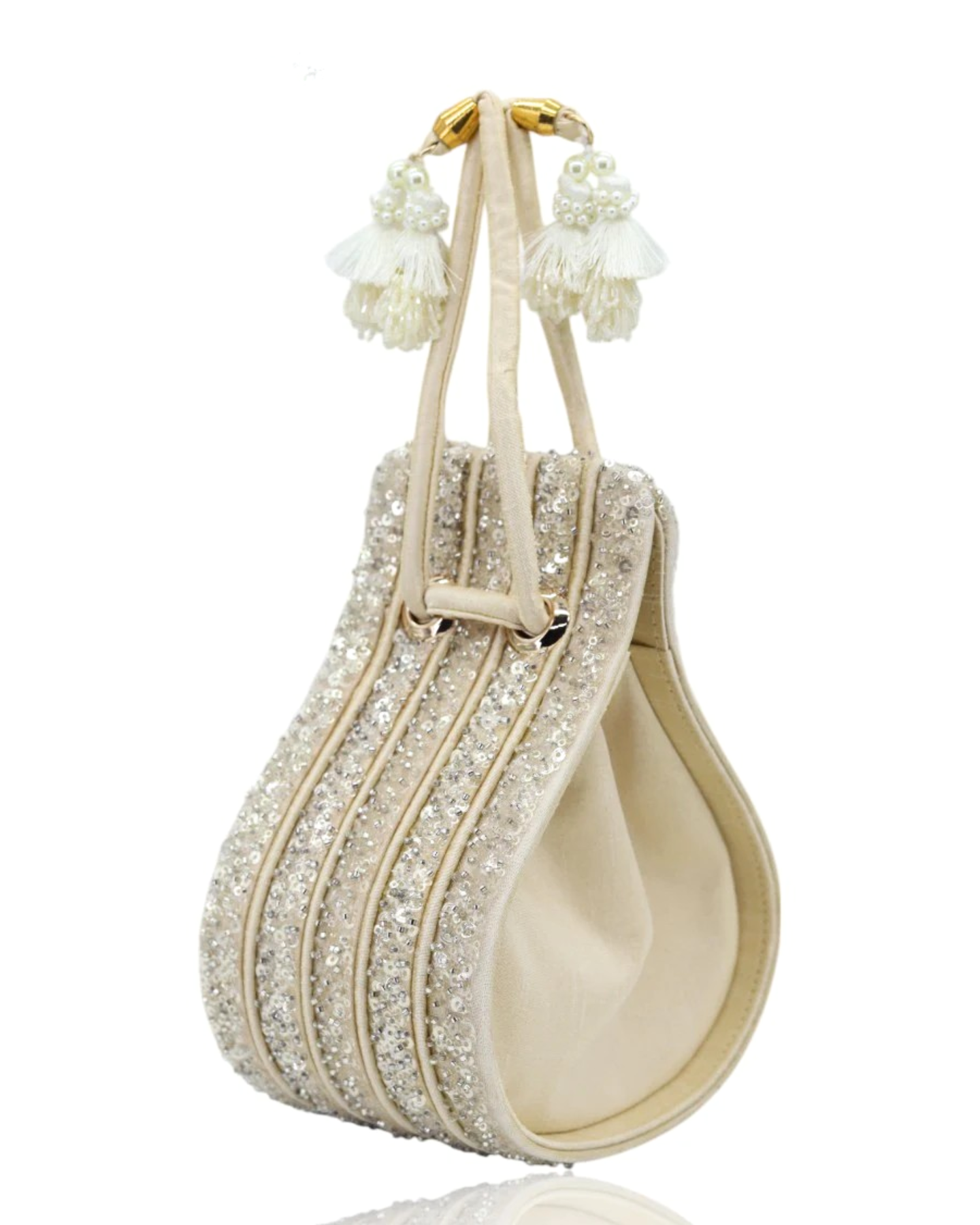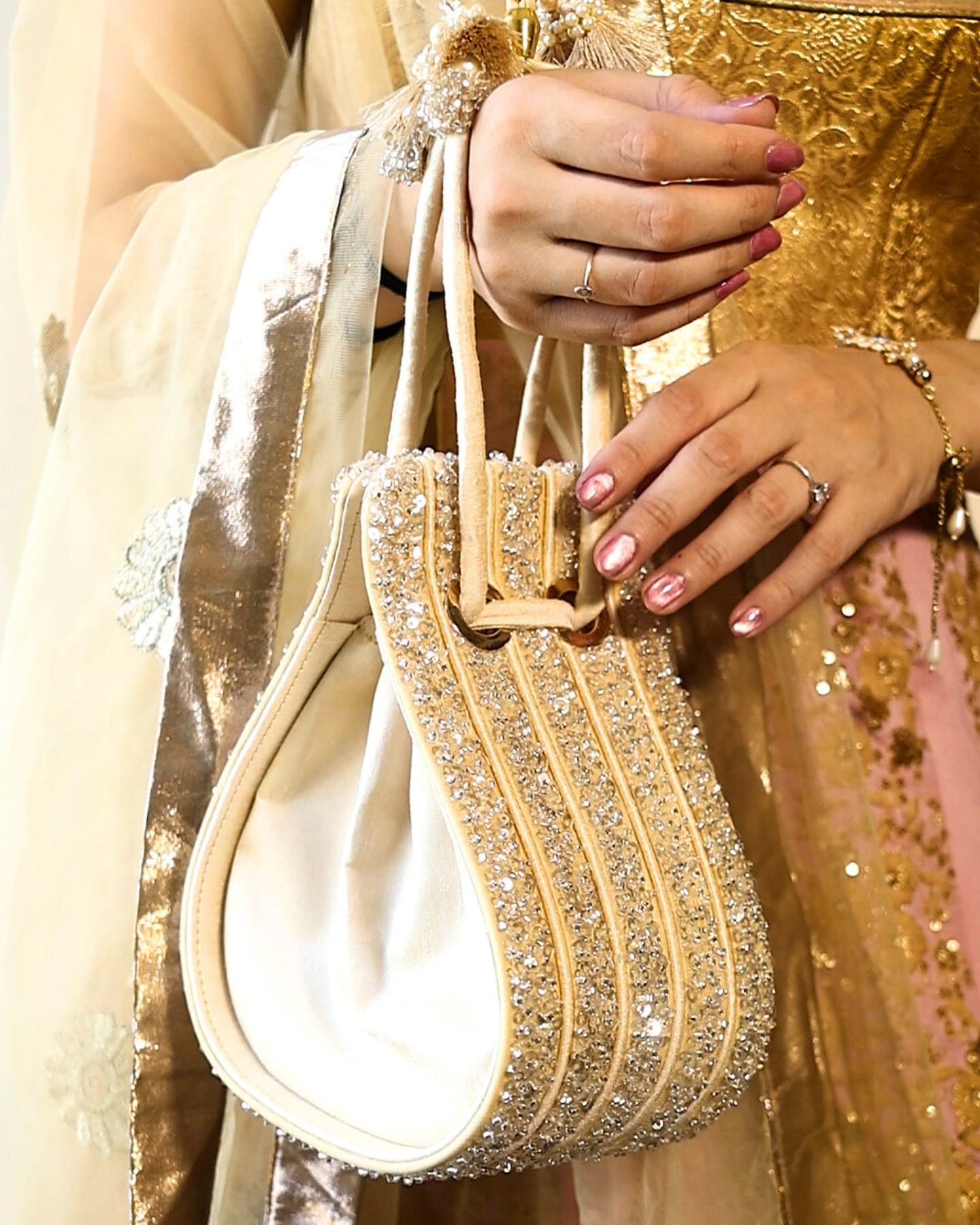 The Palki Potli Bag is crafted with intricate hand embroidery, luxurious detailing, and a timeless festive look, perfect for weddings, sangeet, mehendi, receptions, and premium gifting.